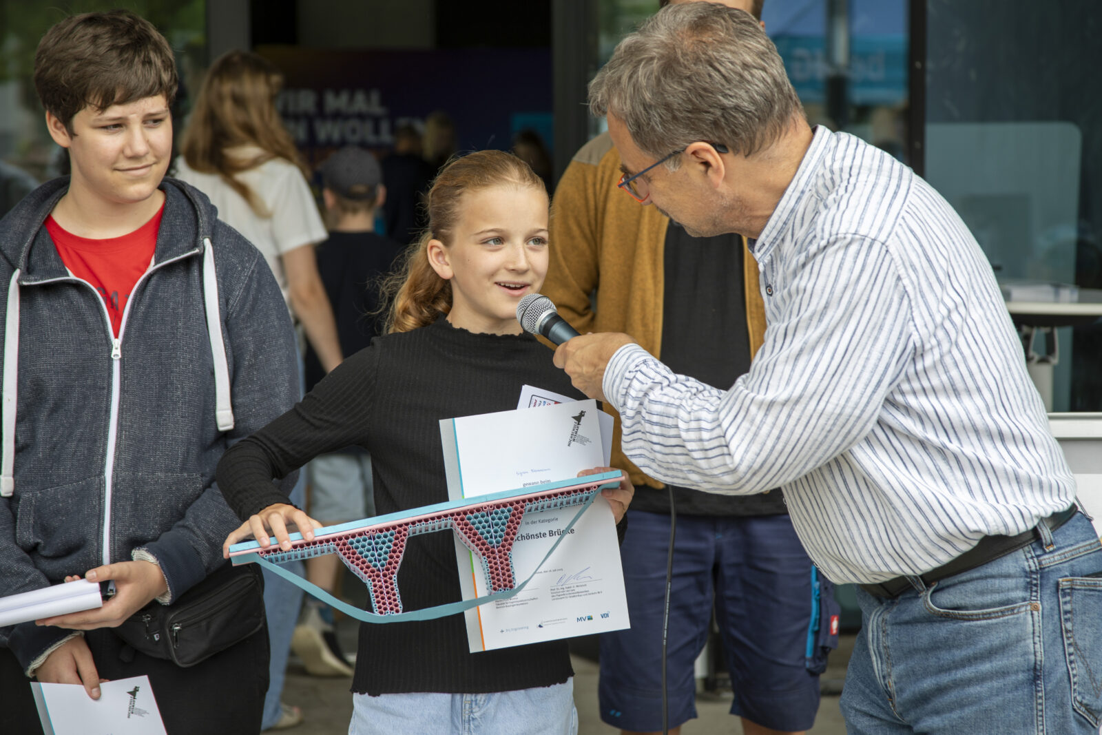 Die Fünft- und Sechstklässler unserer Schule waren am 18. Juli 2025 zum Papierbrückenbauwettbewerb auf dem Campus der Hochschule Wismar. Unsere Schüler Jari Ostendorf und Finn Winkler belegten dabei den 1. Platz in der Kategorie bis einschließlich 8. Klasse. Ihre Brücke hat mit 194 Gramm Eigengewicht 21,8 Kilogramm standgehalten. Herzlichen Glückwunsch zu diesem wunderbaren Ergebnis. Der Preis für die schönste Brücke ging ebenfalls an die CMS. Sigrun Neumann konnte wie schon 2024 den Preis dafür in Empfang nehmen.